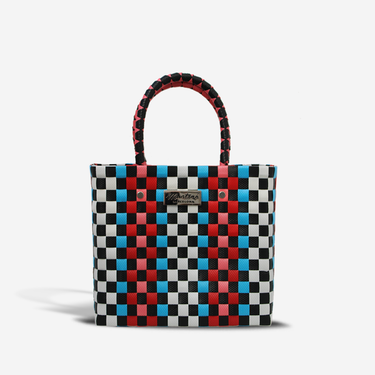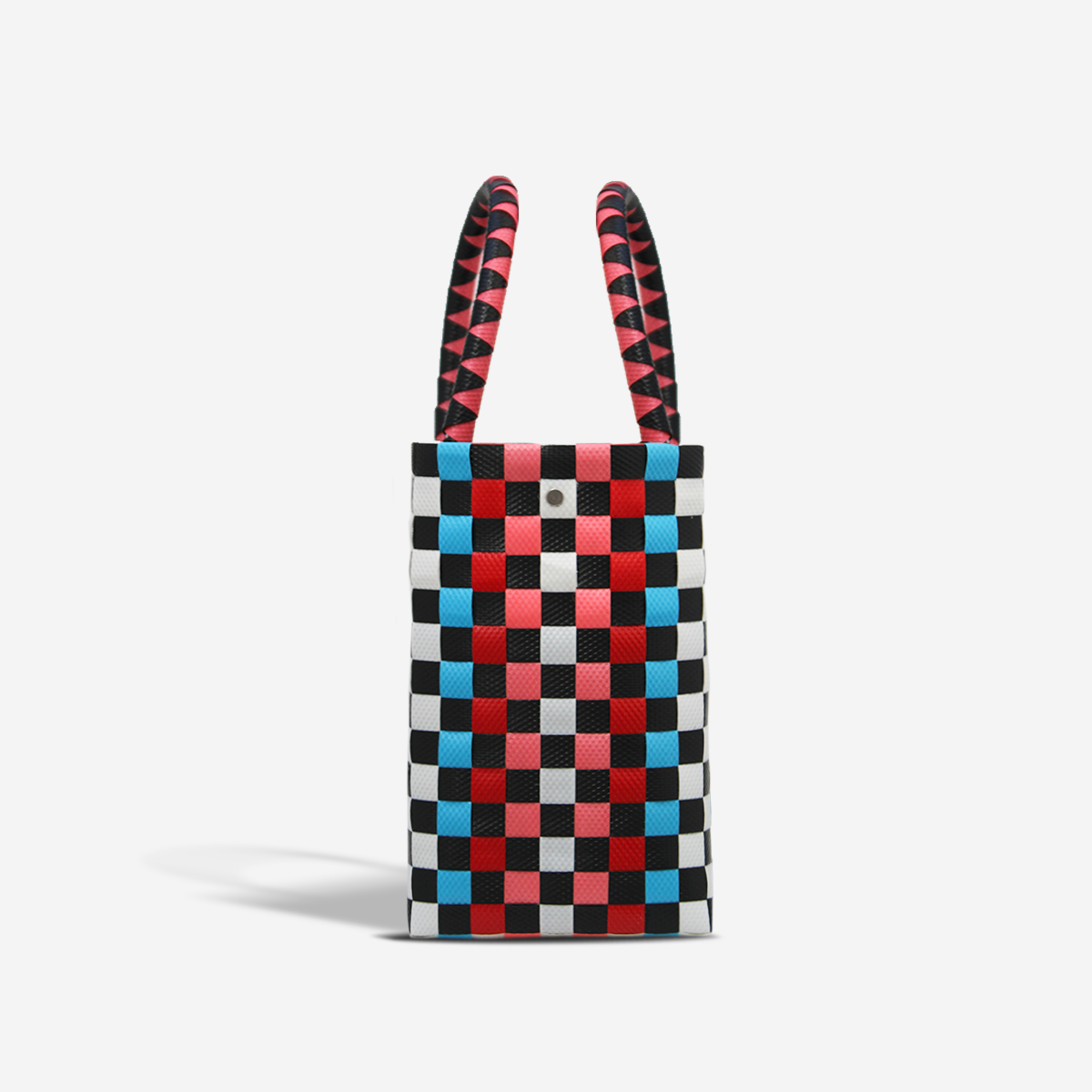 Diseño trenzado multicolor: blanco, negro, azul cielo, rojo y rosa salmón.