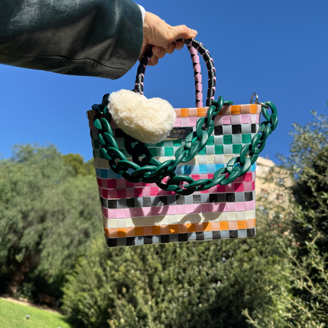 Diseño trenzado multicolor: Amarillo Mostaza, Rosa Claro, Negro, Verde Oscuro, Blanco Hueso, Rojo, Azul Cielo y Transparente.