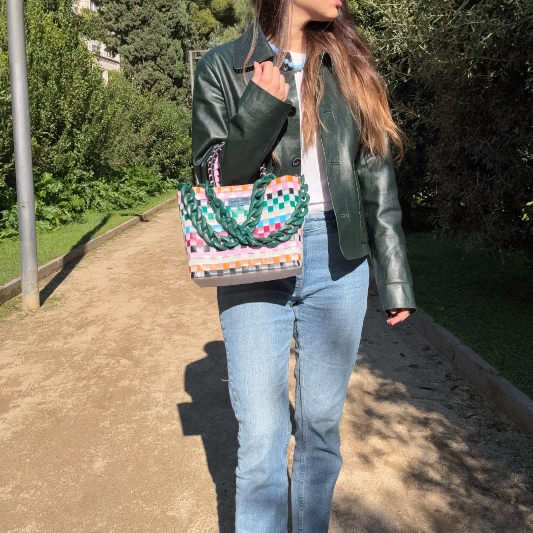 Nuestros bolsos están hechos con materiales sostenibles como el polipropileno reciclado.