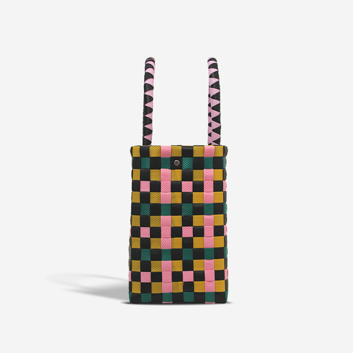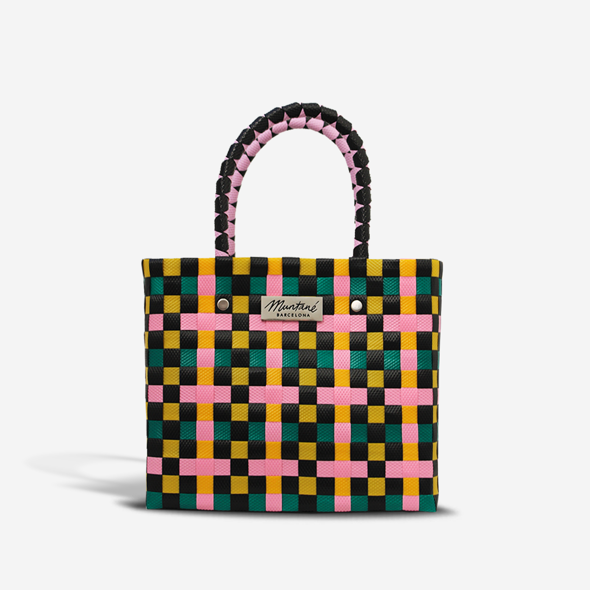 Diseño trenzado multicolor: verde oscuro, negro, amarillo y rosa claro.